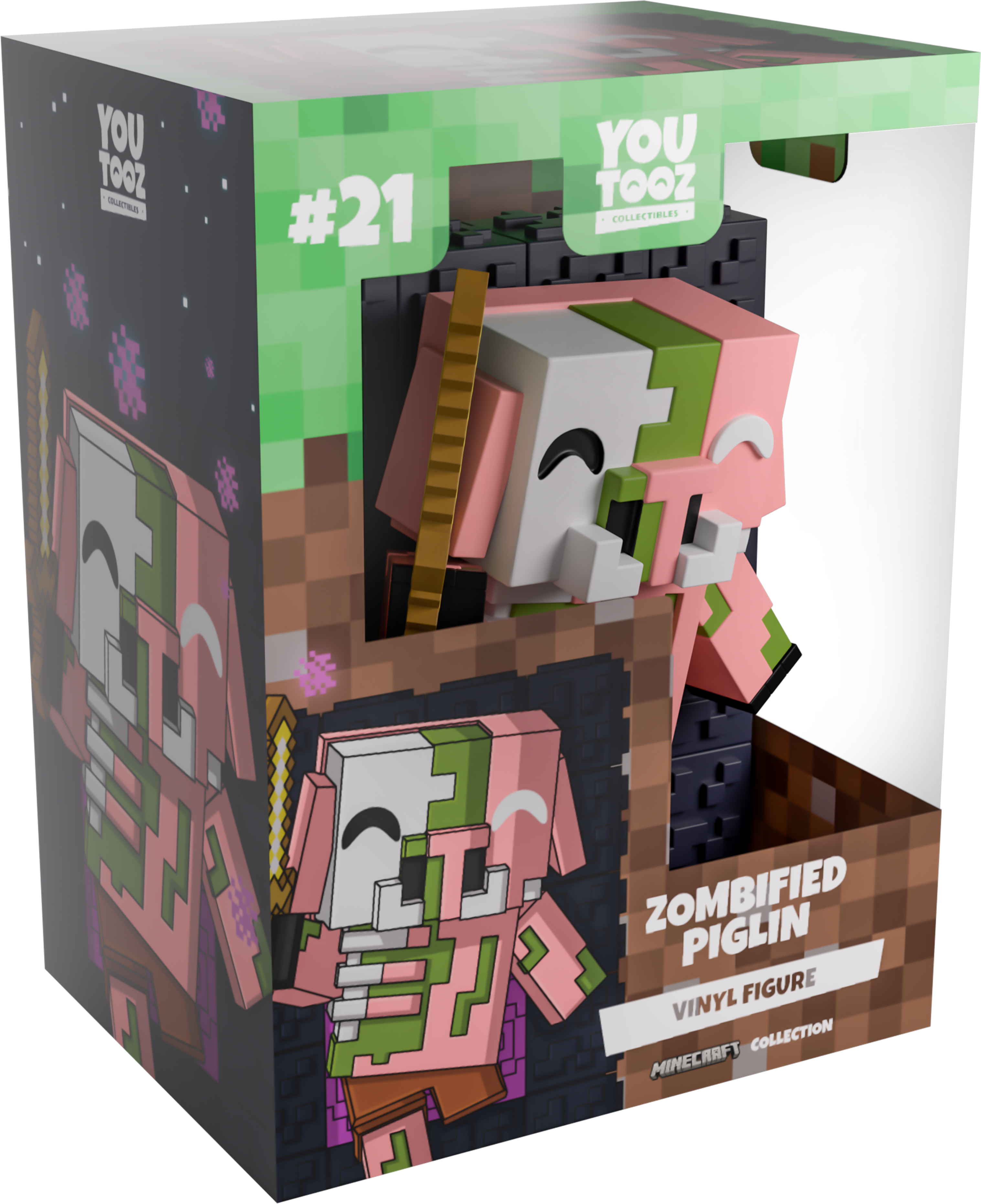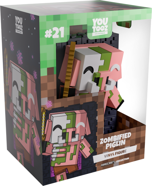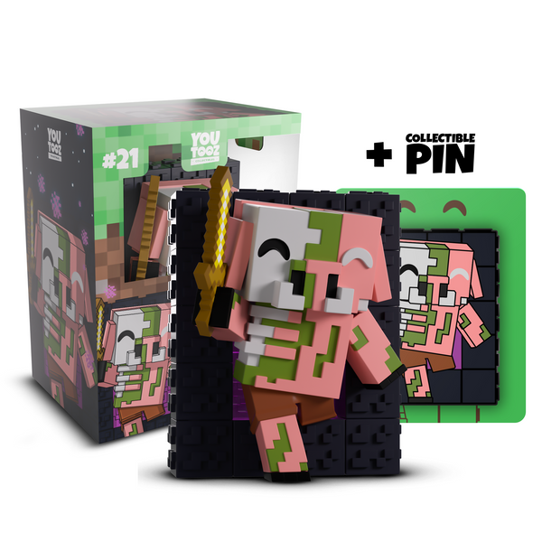 Wait, did you leave the Nether Portal unattended? Surely nothing sinister is going to come through it… right? Bursting through the entrance of a purple and black nether portal with a gold sword raised in their right hoof, their now zombified pink body has withered away to show ghastly green skin and exposed grey bone as they wear nothing but brown shorts. The exterior of their packaging sees a swirling nether portal in a dark field. While the interior surrounds them in brown dirt blocks, this then continues onto the protective sleeve as their figure can be seen through the large, clear window at the packaging’s front. This collectible ships in a matte, embossed, protective outer sleeve and a custom-sized plastic protector for maximum protection during shipping.